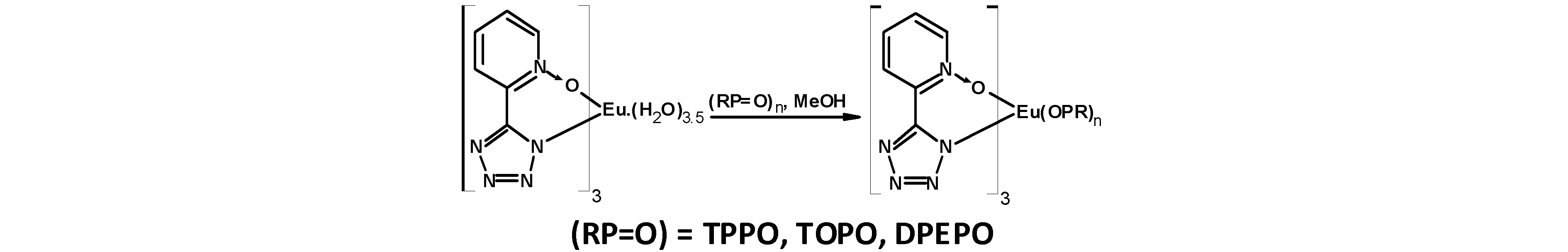 A variety of combinations can be obtained with different substituents attached to pyrazolone, or oxazolone rings, however, the strongest impact on photoluminescence quantum yields is the formation of ternary complexes with elaborated phosphine oxides, as illustrated above.