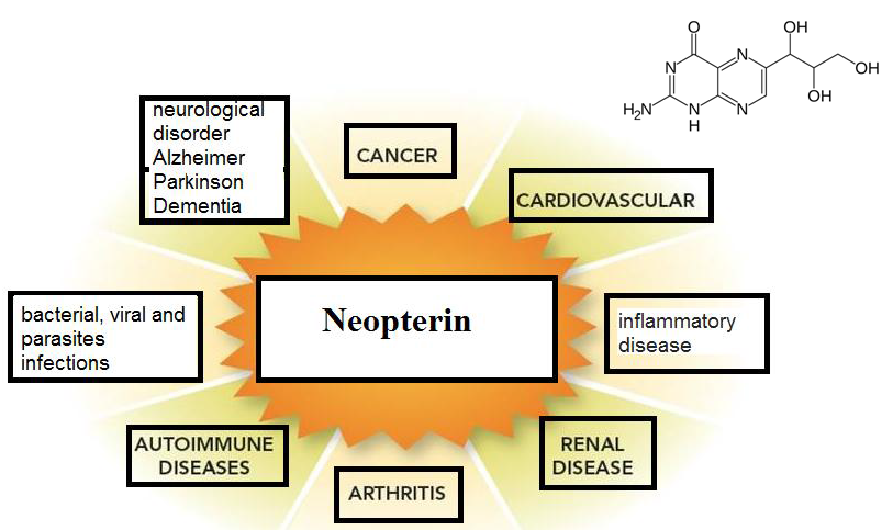 Neopterin (2-amino-6-(1,2,3-trihydroxypropyl)-1H-pteridin-4-one) is a marker of cellular immune system activation. Using SERS, we are able to detect neopterin at low concentration in blood plasma and bacteria-infected cerebrospinal fluid. In these studies, three meningitis pathogens, namely, Neisseria meningitidis, Haemophilus influenzae, and Streptococcus pneumoniae were detected and identified simultaneously using a label-free SERS method.