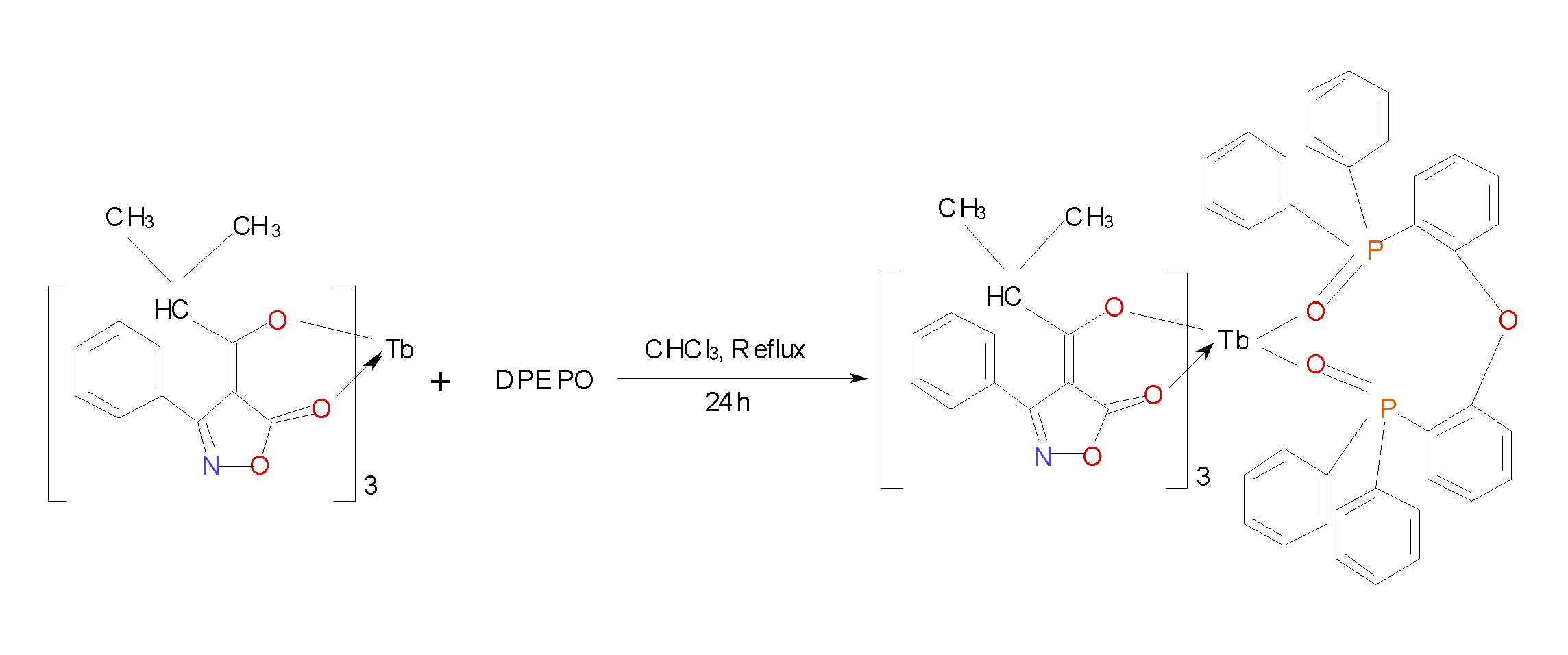 A variety of combinations can be obtained with different substituents attached to pyrazolone, or oxazolone rings, however, the strongest impact on photoluminescence quantum yields is the formation of ternary complexes with elaborated phosphine oxides, as illustrated above.