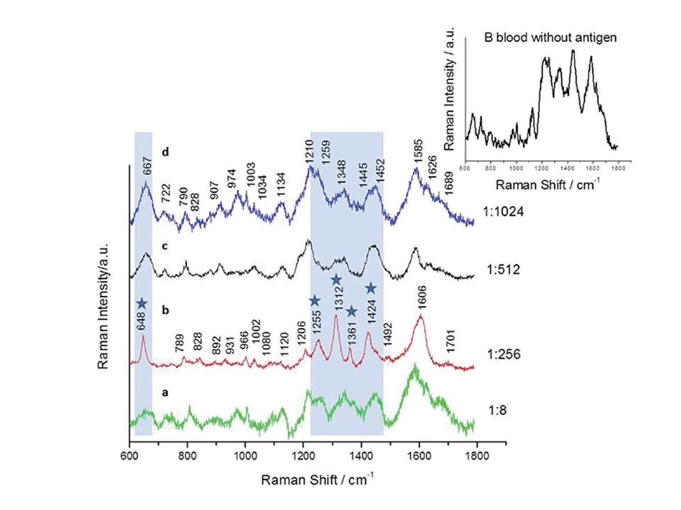 Combination of SERS with Principle Component Analysis (PCA) allows segregating different antigen-antibody interactions into separate clusters, which subsequently makes it possible to differentiate among ABO blood groups. Distinctive spectral changes among all types of the studied blood groups were found for mixtures of red blood cells (RBCs) with the A or B antibody. For PCA analysis, all the spectral data were divided into two main groups based on the type of antibody. The obtained PC scores in the area marking antigen–antibody interactions (1311–1345 cm-1) allow differentiation within blood groups with accuracy from 96% to 98%.