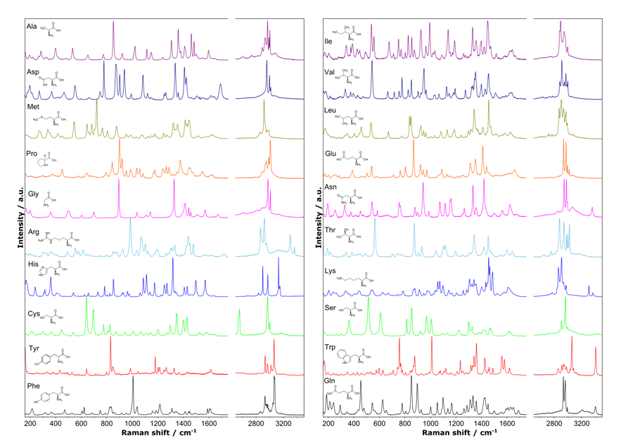 Raman spectra of solid amino acids measured at 293 K using 632.8 nm laser line.